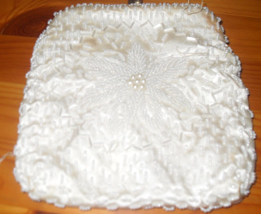 EVENING BAG. CREAM,BEADED FLOWER PATTERN CLASP A FEW LOOSE BEADS AND A FEW BEADS MISSING